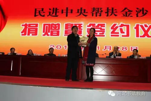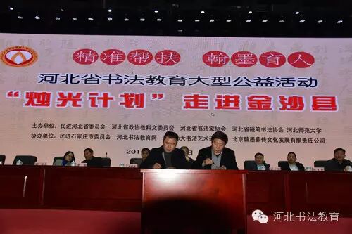 朱永新主席会见河北代表 活动现场,民进河北省委会代表主办单位与金沙县教育局签订河北书法教育“烛光计划”对口帮扶金沙协议。协议内容为每年帮扶一所学校,打造书法示范学校;每年选派书法名师,义务举办全县中小学书法教师培训;每年通过网络课堂,定期讲评师生书法作业和作品;协议期限为三年,累计打造3所示范学校,培训600余名书法教师,受益师生9000人次以上,全力助推中小学书法教育开展。
